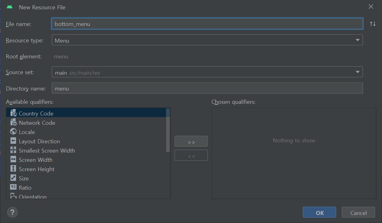 5개 버튼 이용해서 res 우클릭 후 New Resource Directory에서 menu 만들고 menu 우클릭 후 bottom_menu.xml 만든다.