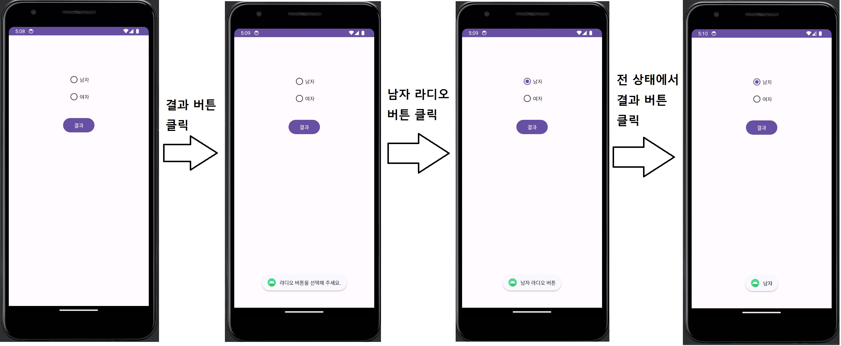 처음에 이렇게만 코딩하면 RadioButton만 눌러도 남자 라디오 버튼, 여자 라디오 버튼의 toast message가 출력된다.