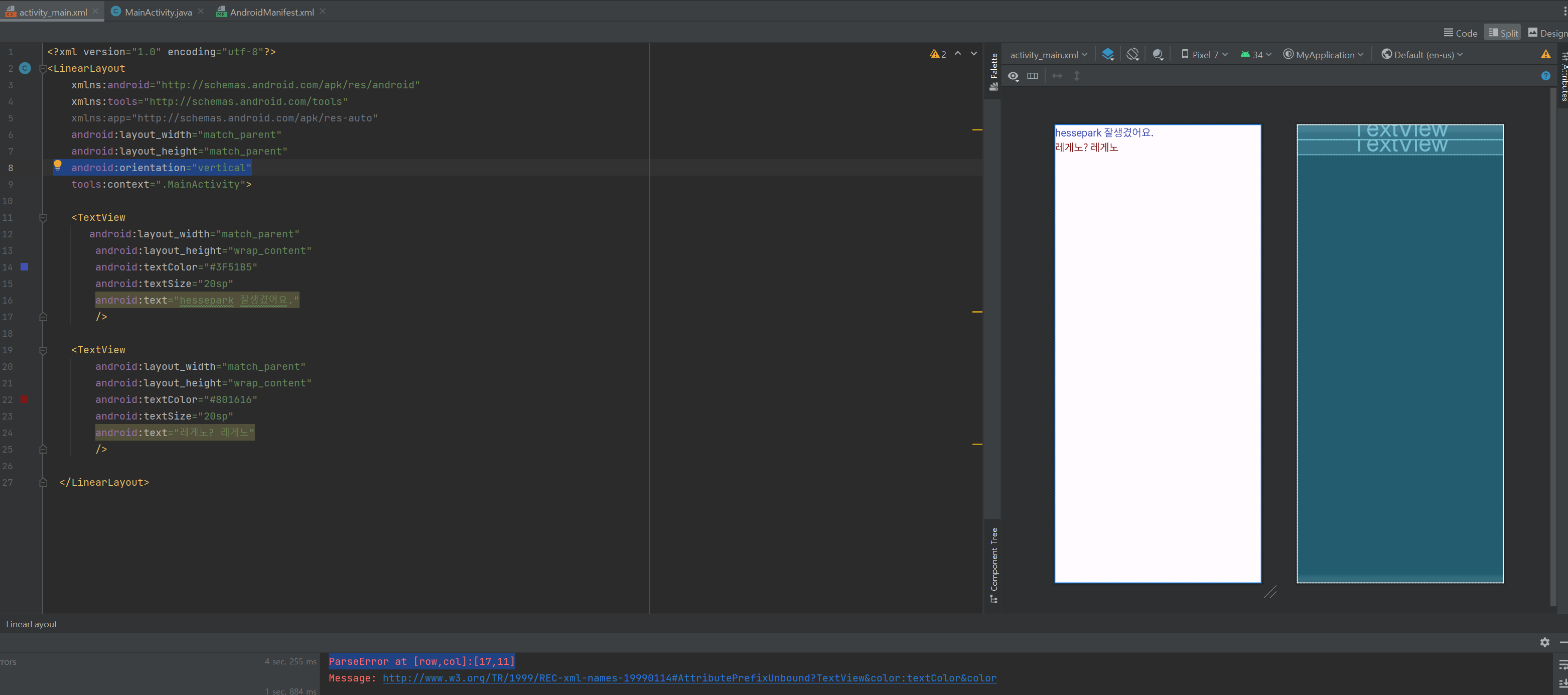 TextView를 하나 더 만들려고 하면 에러가 뜨는데 이는 배치 문제 때문에