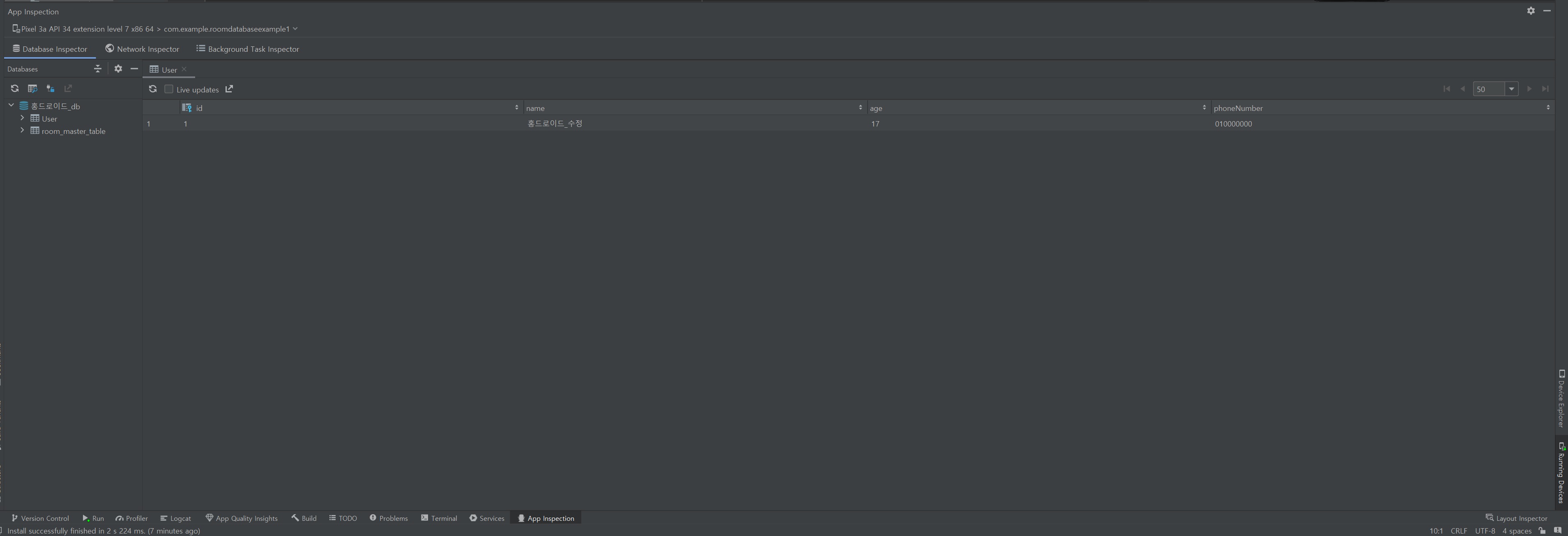 UserDatabase database = Room.databaseBuilder(getApplicationContext(), UserDatabase.class, "홍드로이드_db")