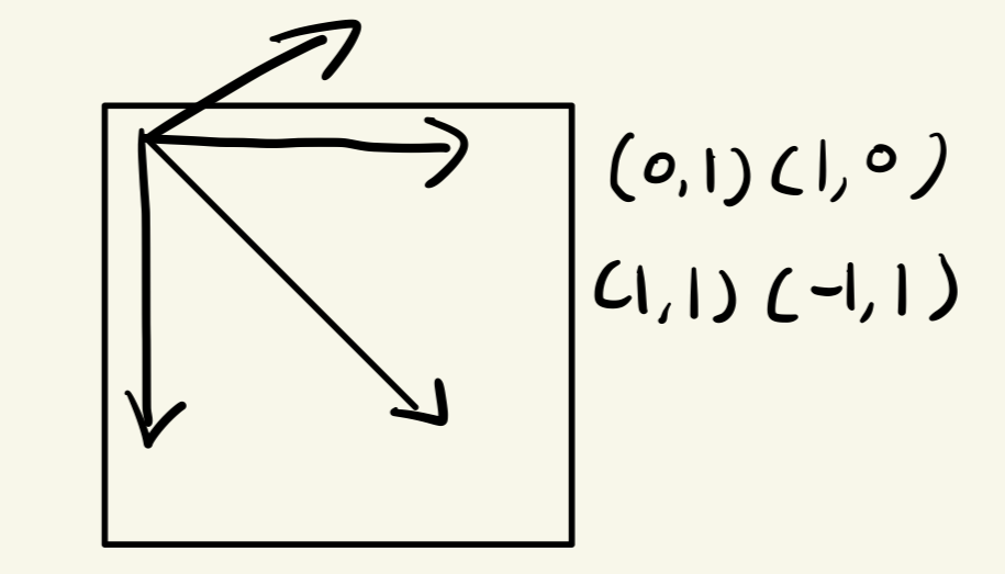 int directions[][] = { { 0, 1 }, { 1, 0 }, { 1, 1 }, { -1, 1 } };